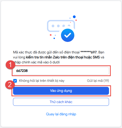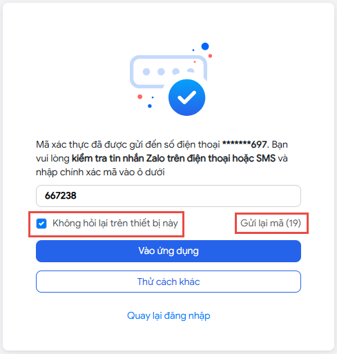 Hệ thống sẽ gửi mã xác thực gồm 6 chữ số về điện thoại thông qua tin nhắn Zalo (ZNS)/SMS: