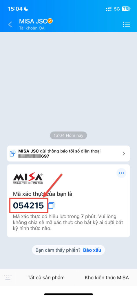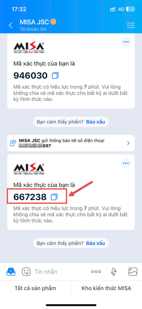 - Người dùng vui lòng truy cập tài khoản Zalo tương ứng với số điện thoại đã được xác thực tại MISA ID để lấy mã và nhập vào ô xác thực.