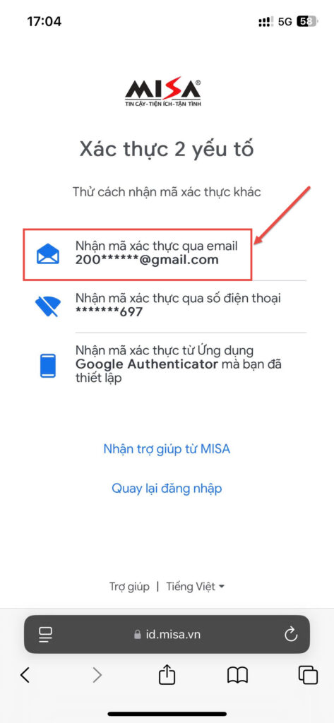 Lưu ý: Người dùng đảm bảo trước đó đã thiết lập xác thực 2FA qua Email và trạng thái của phương thức này trên MISA ID là Đã xác thực.