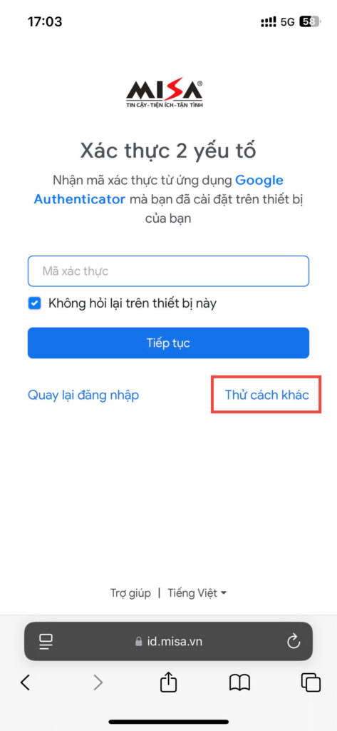 Ngoài phương thức xác thực mặc định là Google Authenticator, người dùng có thể xác thực bằng phương thức khác bằng cách nhấn Thử cách khác rồi chọn nhận mã xác thực qua Email.