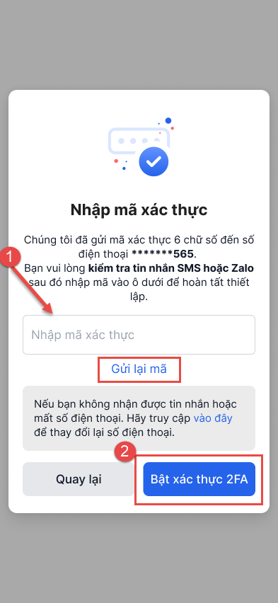 Tương tự các thao tác Thiết lập bảo mật 2FA bằng số điện thoại trên Website. Anh/chị nhập mã xác thực được gửi về tin nhắn Zalo hoặc SMS rồi nhấn Bật xác thực 2FA để hoàn tất thiết lập.