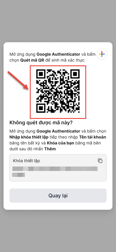 Nếu anh/chị chọn Tôi đã cài Google Authenticator trên thiết bị khác trên màn hình sẽ hiển thị mã QR code và Khóa thiết lập, anh/chị nhập thủ công rồi nhấn chọn Bật xác thực 2FA.