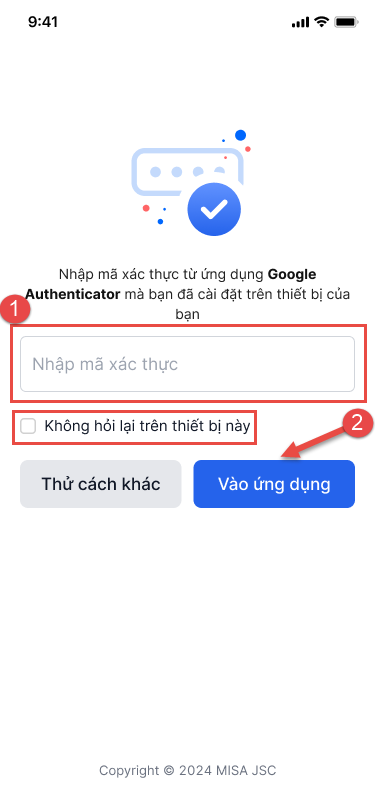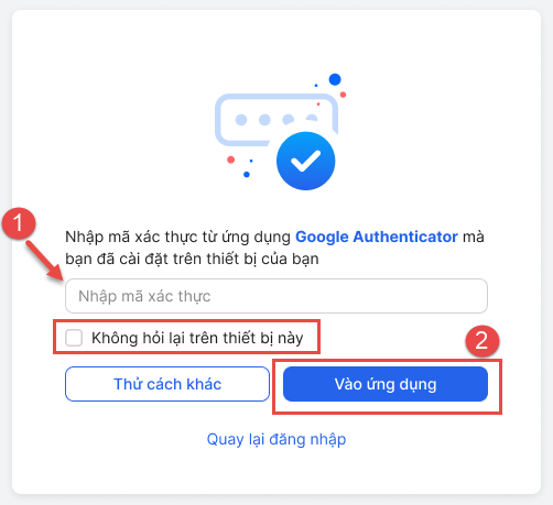 Anh/chị đăng nhập thành công rồi nhập mã xác thực lấy ở Google Authenticator để vào ứng dụng. Anh/chị có thể chọn Không hỏi lại trên thiết bị này để lần sau đăng nhập trên thiết bị này không cần xác thực lại.