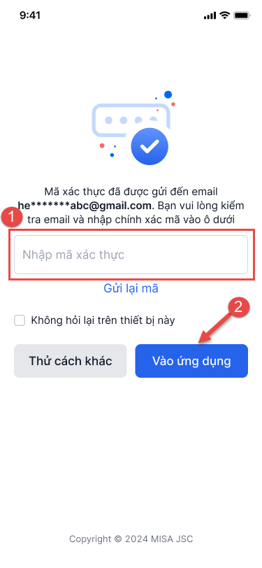 Anh/chị có thể chọn nhận mã xác thực qua email, nhập mã xác thực và nhấn Vào ứng dụng để hoàn tất.