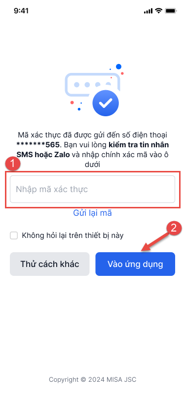 Tương tự như trên, đăng nhập xác thực với số điện thoại, anh/chị nhấn Nhận mã xác thực qua số điện thoại. Anh/chị kiểm tra mã xác thực được gửi về tin nhắn Zalo hoặc SMS, nhập mã gồm 6 chữ số đó vào ô trống, nhấn Vào ứng dụng là xong.