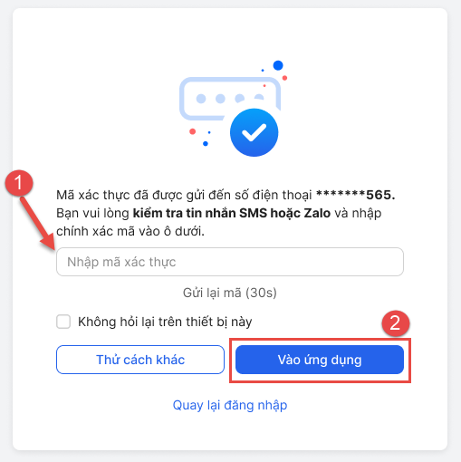 Anh/chị có thể chọn nhận mã xác thực qua số điện thoại, nhập mã xác thực được gửi qua Zalo hoặc SMS và nhấn Vào ứng dụng để hoàn tất.