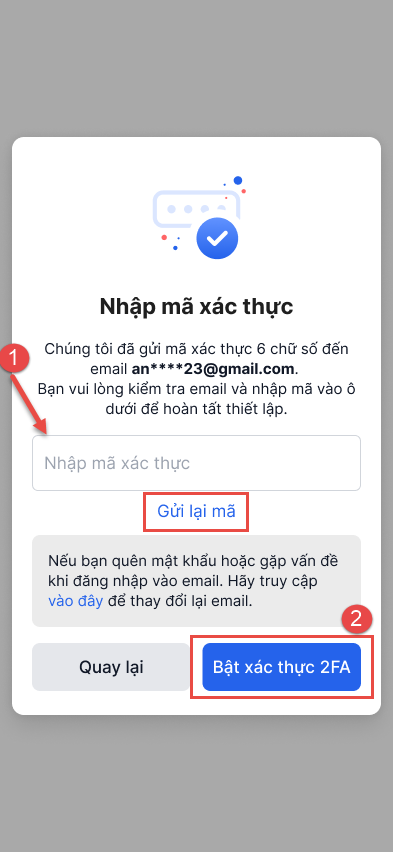 Anh/chị thao tác tương tự luồng trên Web. Nhập mã xác thực được lấy từ email và nhấn Bật xác thực 2FA để hoàn tất
