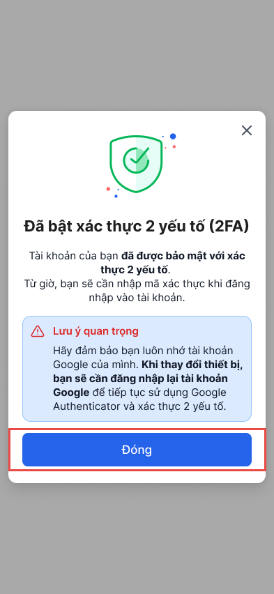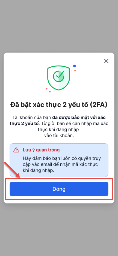 Sau khi thiết lập bảo mật thành công, anh/chị nhấn chọn Đóng để đóng thông báo và tiếp tục làm việc.