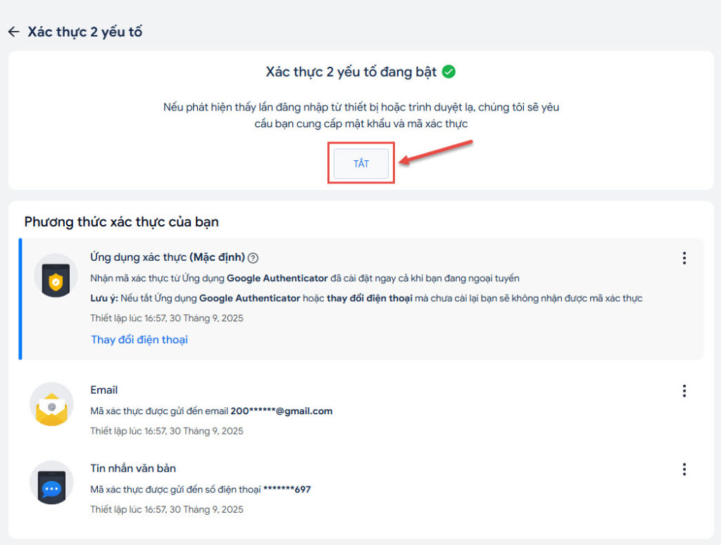 - Sau khi tắt xác thực 2 yếu tố, trạng thái sẽ được cập nhật là Đang tắt.