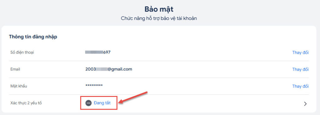 - Nhấn vào mục Xác thực 2 yếu tố.